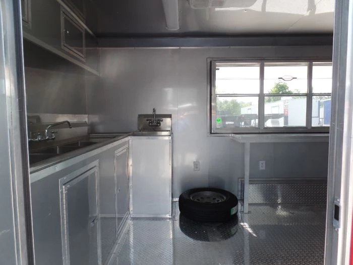 - 8′ Concession window with sliding glass and screens and a flip up counter outside