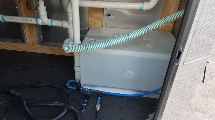 - Sink package with 30 gals. fresh, 50 gals. waste, 2.5 gals. water heater Splash guard between hand sink and 3 comp sink