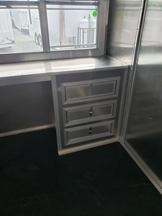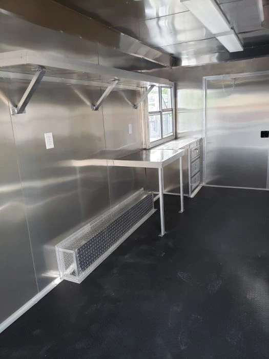 - Aluminum mill finish walls and ceiling, stainless steel behind the hood