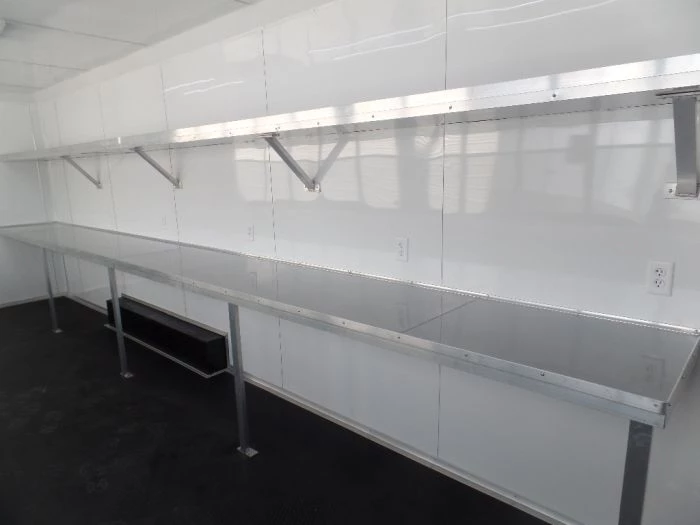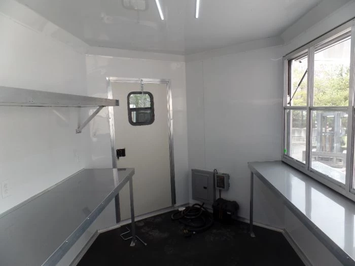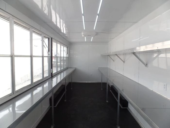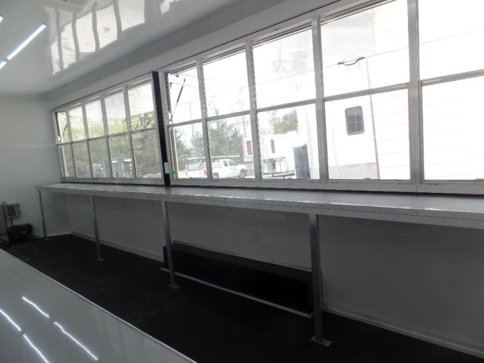 - (2) 48″ x 10′ Concession windows with glass and screens and flip up counter outside