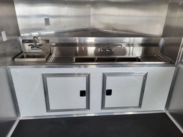 This concession trailer doesn’t feature cooking equipment such as a fryer, fridge, or smoker those are separate items that can be bundled and will increase the price at check out please call for additional information. Fire suppression and propane packages are also available.Â
