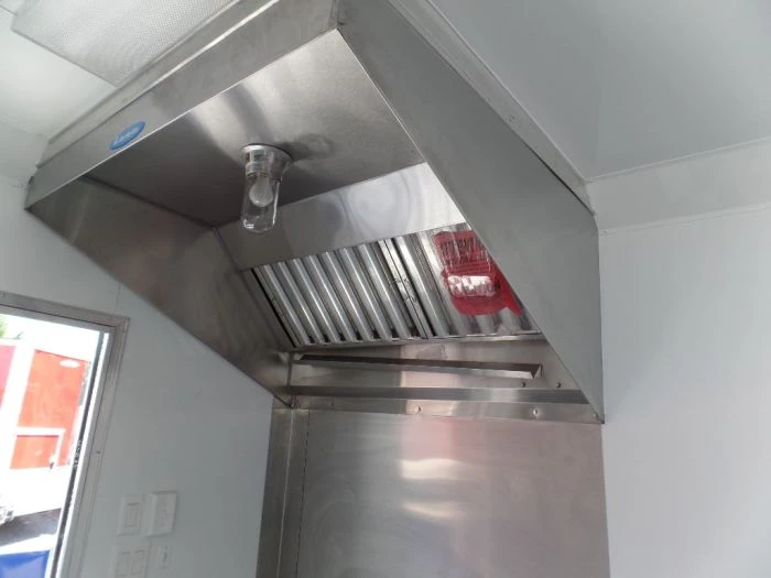 - White metal walls and ceiling, stainless steel on wall under hood only