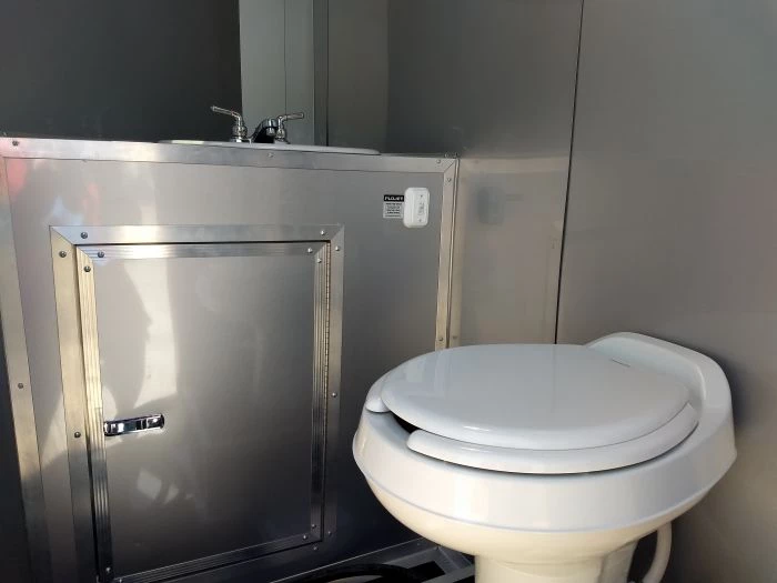 - Restroom package with toilet, sink, light, extraction roof vent, and its own water supply