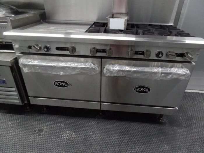 - 60″ Range with 6 burner stove with ovens below 24″ raised griddle and broiler below griddle