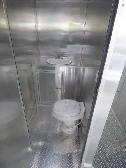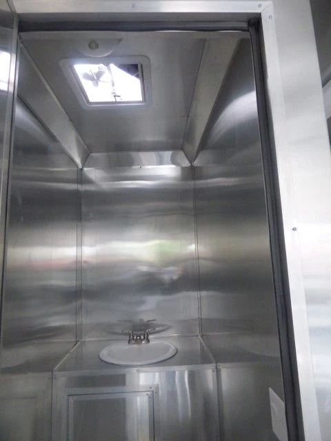 - Restroom with toilet, hand sink, light, roof vent, and water supply