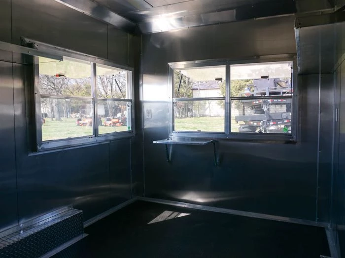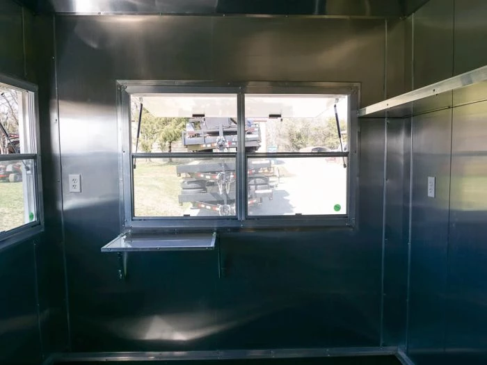 - (2) 5′ Concession window with glass and screens with flip-up counter outside