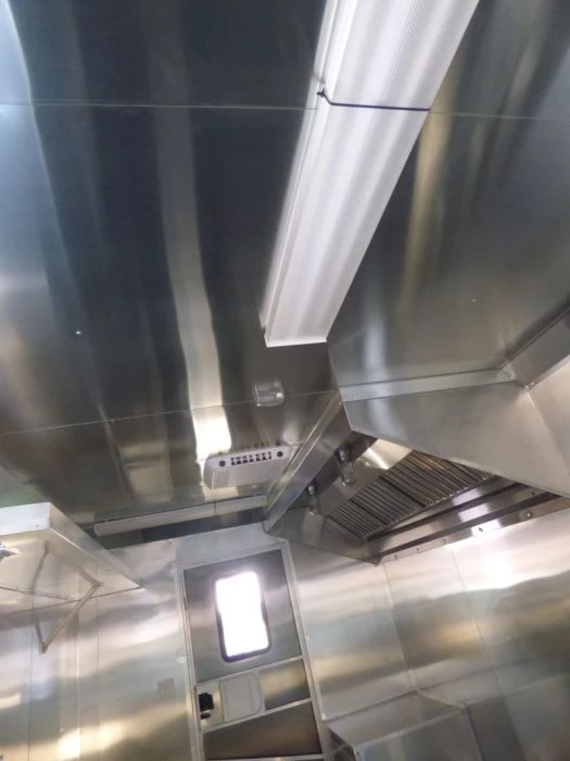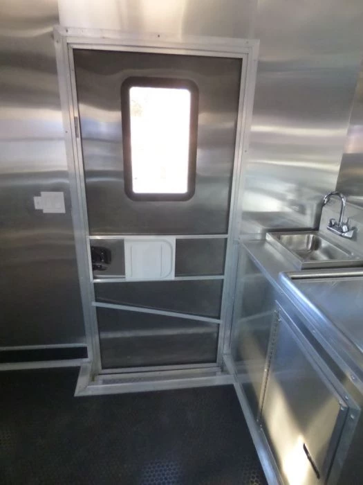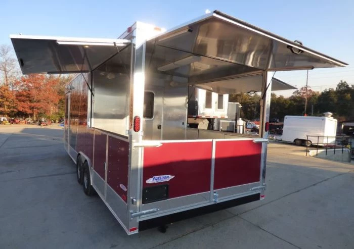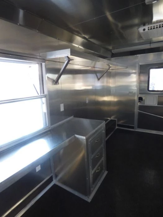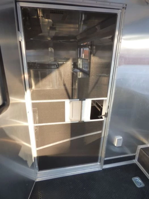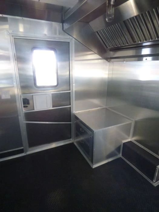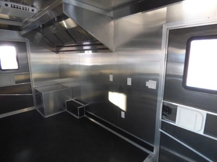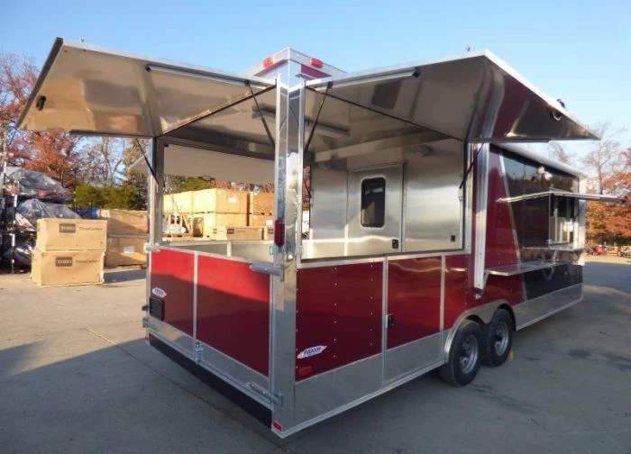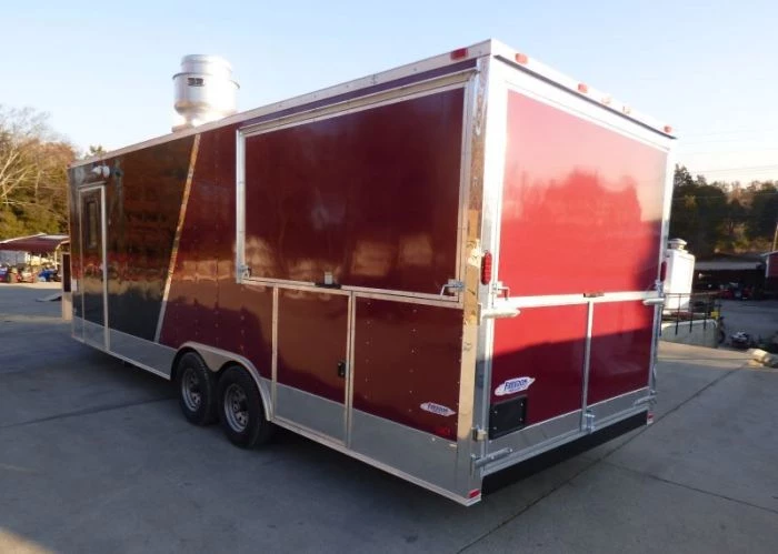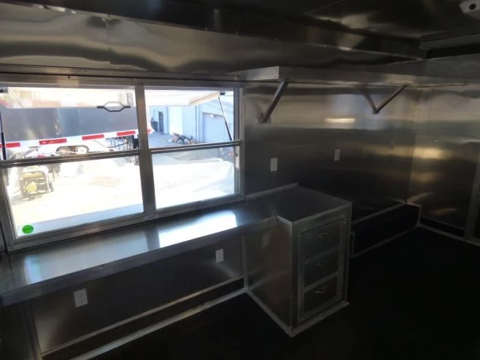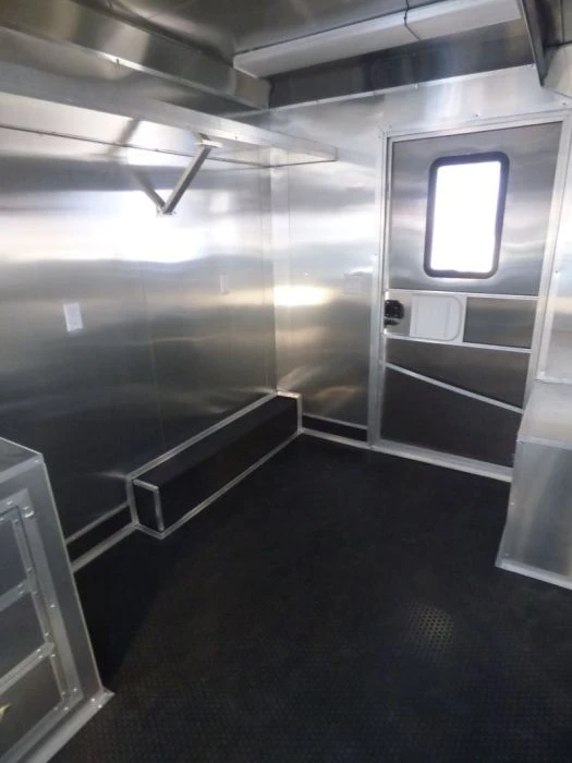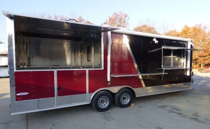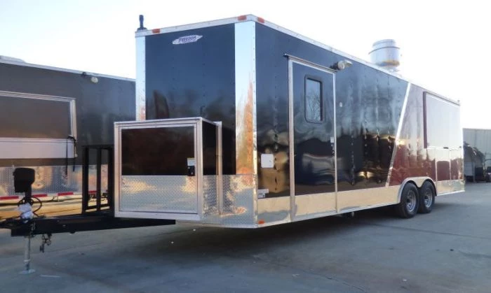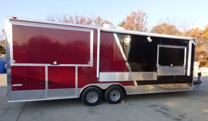 exterior color black for the front section with a 4′ anodized strip diagonal towards rear of trailer and brandywine for the rear section