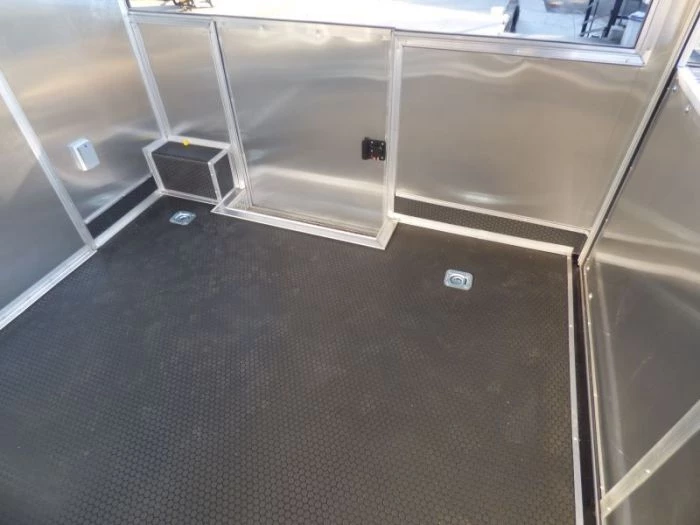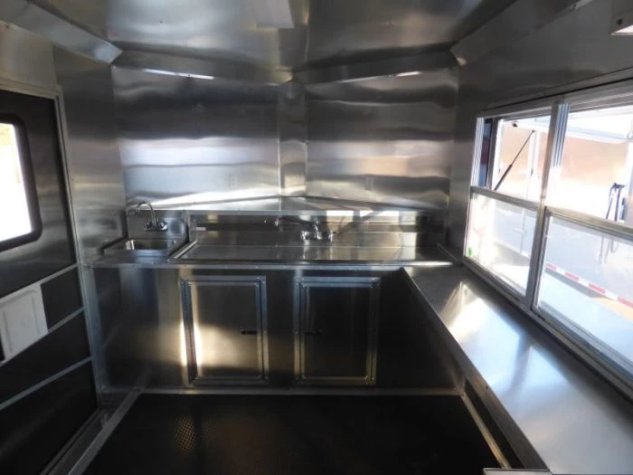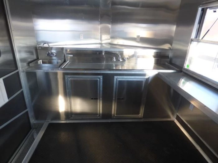 sink package with 30 gal. fresh, 50 gal. waste, 12 gal. water heater with a vent for the waste tank to go up the v-nose and through the ceiling