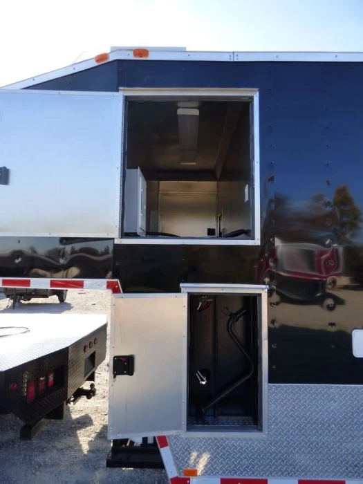 porch area with 36′ lower stationary wall with flip up door above and rear lower 36′ barn style doors with upper flipup