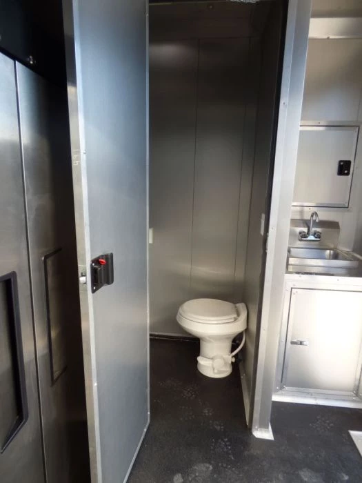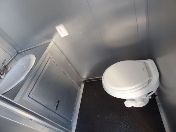 restroom with toilet, hand sink, light, roof vent and its own fresh and waste water suply