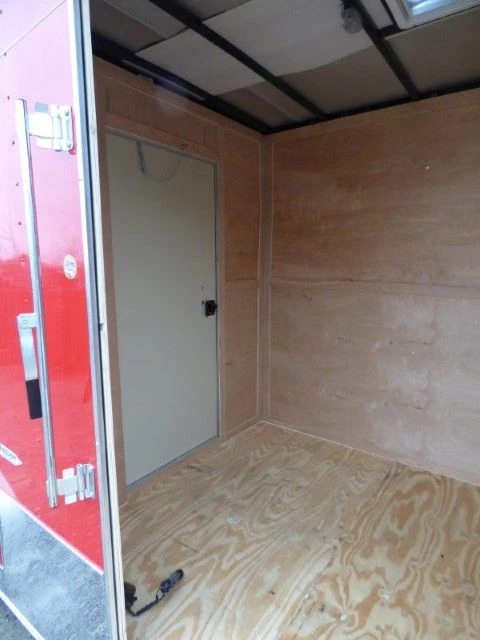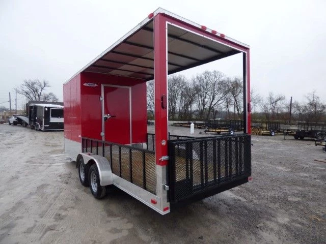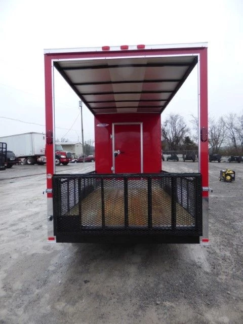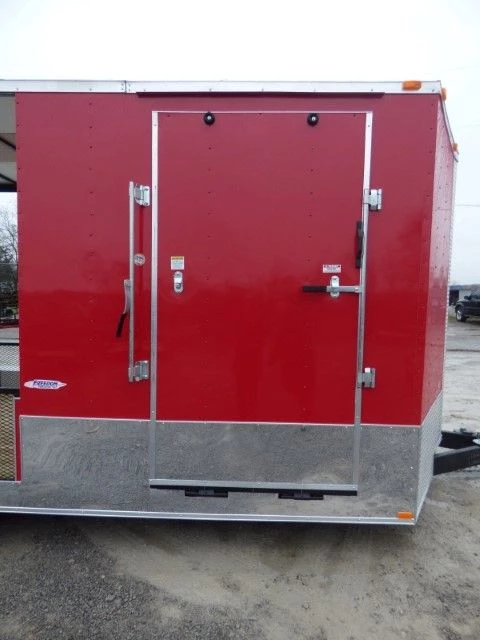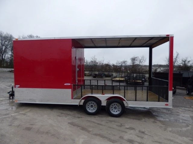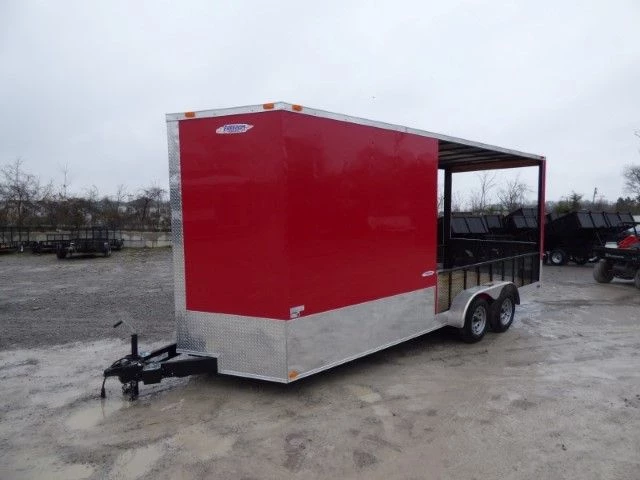 - (1) 7×20 Red V-nose hybrid trailer with roof over rear area