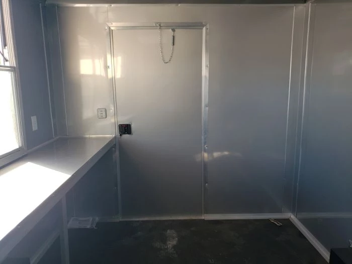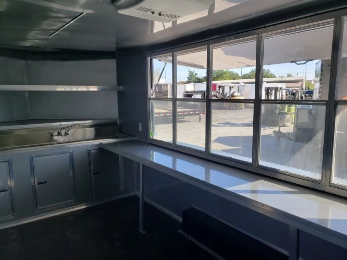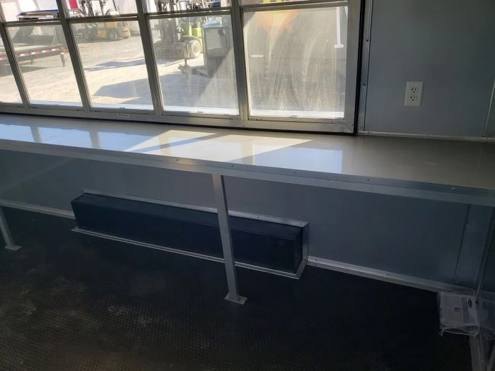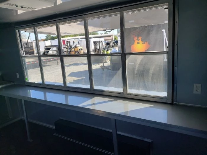 - 48″ X 10′ concession window with glass and screens with flip up counter outside
